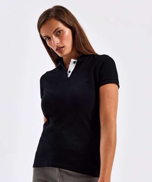 Fitted polo for women with contrast collar and placket. Two contrast coloured buttons on placket. Contrast colour on side vents. Twin needle stitching on hem. Ribbed knit collar and sleeve cuffs.