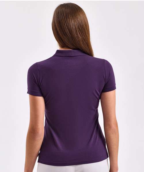 Classic fit polo for women, ribbed knit collar and sleeve cuffs. Twin needle stitching on hem. Two self coloured buttons on placket.