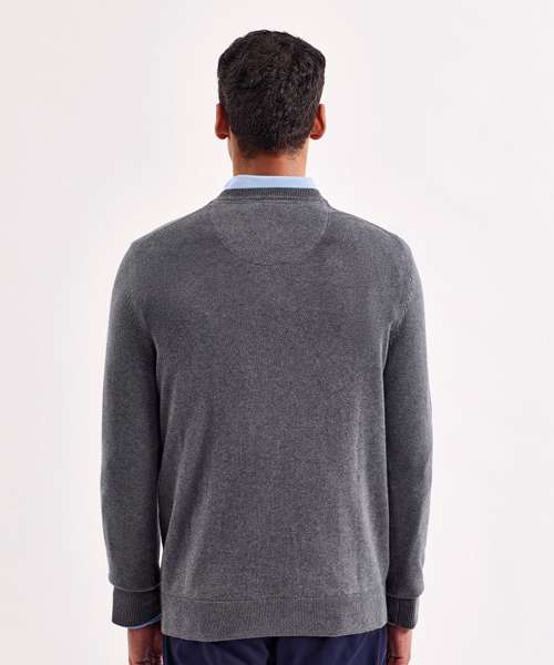 V-neck style jumper. Patch on the inside reverse neck for a contrast effect. Decorative tuck stitching. Ribbed knit on the neckline, cuffs and hem.