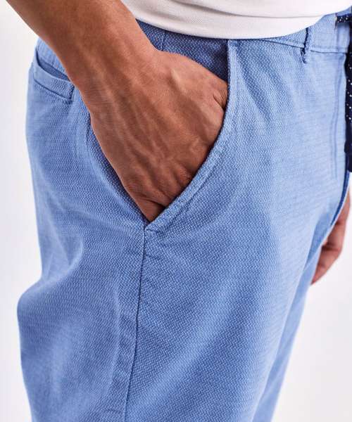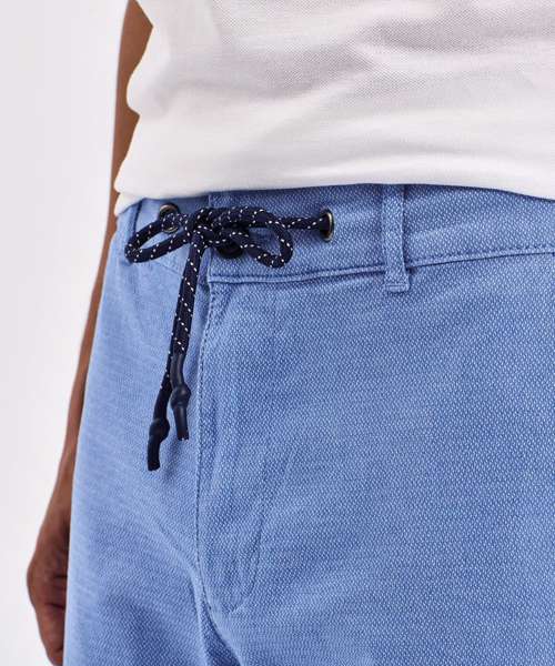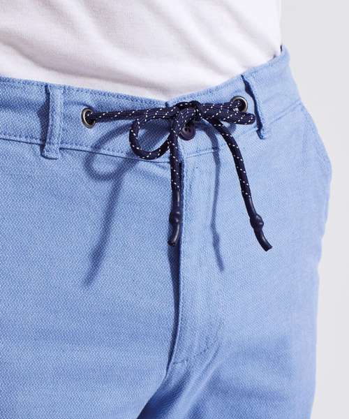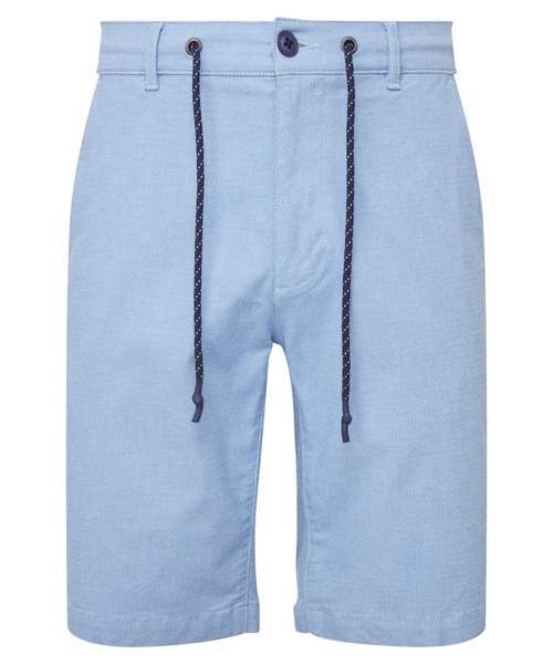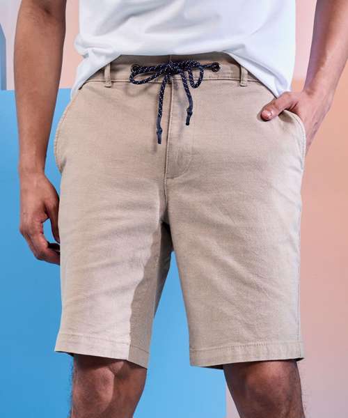 Men’s chino shorts with two swing pockets and two back jet pockets. Zip fly and button fastening to the front. Belt loops. Drawstring detailing.