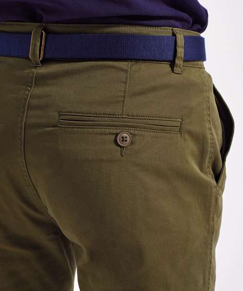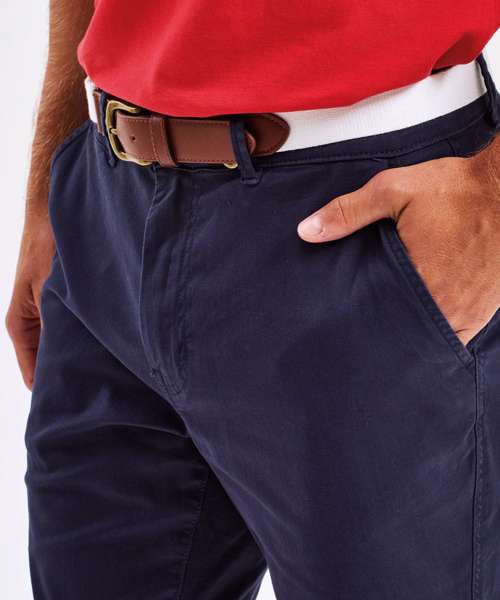 Men’s chino shorts with two swing pockets and two back jet pockets. Zip fly and button fastening to the front. Soft-finish lightweight fabric. Belt loops. Style can be worn rolled up.