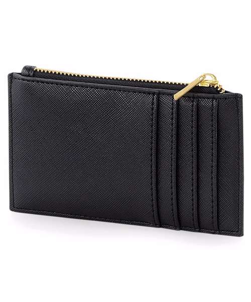 TearAway label for ease of rebranding. Saffiano fine grain. Contemporary slimline design. Can be decorated front and rear. Holds 4 credit cards. Soft-touch lining.