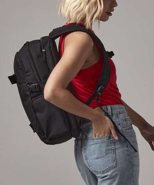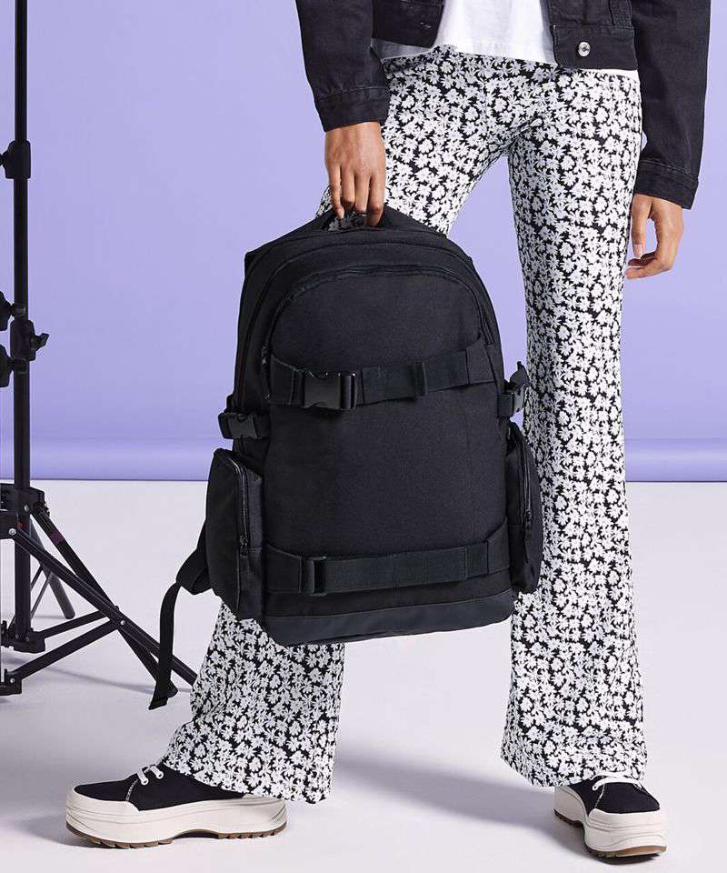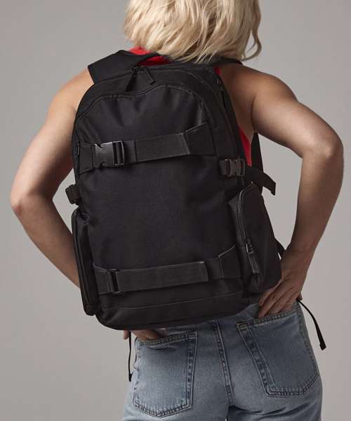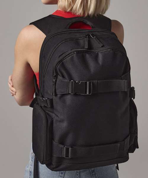 TearAway label for ease of rebranding. Laptop compatible up to 17". External access padded laptop compartment. Skateboard carry straps. Internal organiser section. Zippered front pocket. Zippered side pockets. Padded back panel. Compression straps. Padded adjustable shoulder straps. Grab handle.