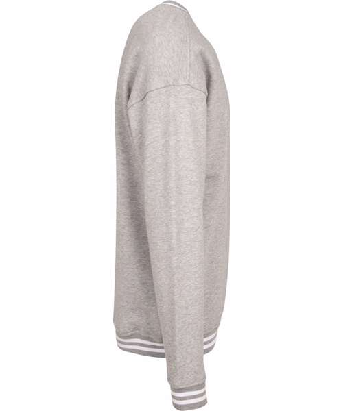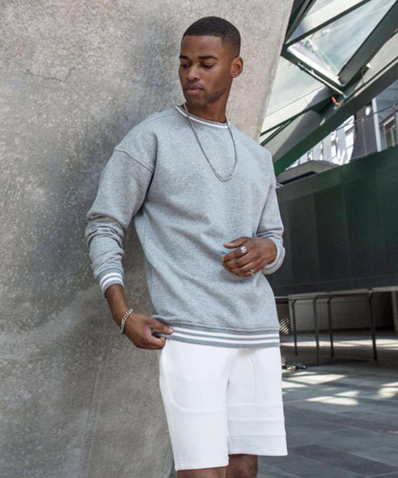 Overcut shoulders, ribbed cuffs at hem, neck and sleeve openings with college stripes, halfmoon at the neck.