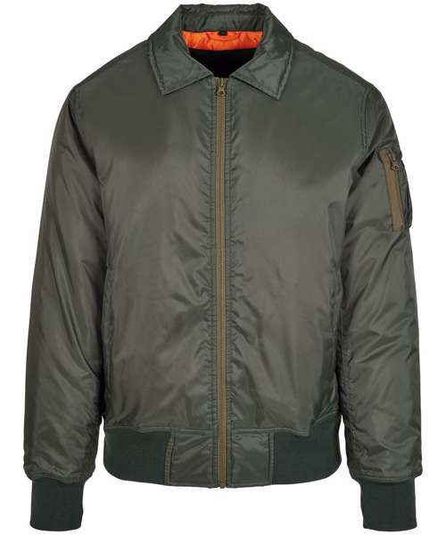 Lined nylon bomber jacket for men with a flashy contrasting lining in orange. Wide ribbed hems and sleeves, a pocket on the sleeve and the turned-down collar provide the classic look and the right fit. The jacket is perfect for refining, thanks to the zippers on the lining hem it can be easily printed.