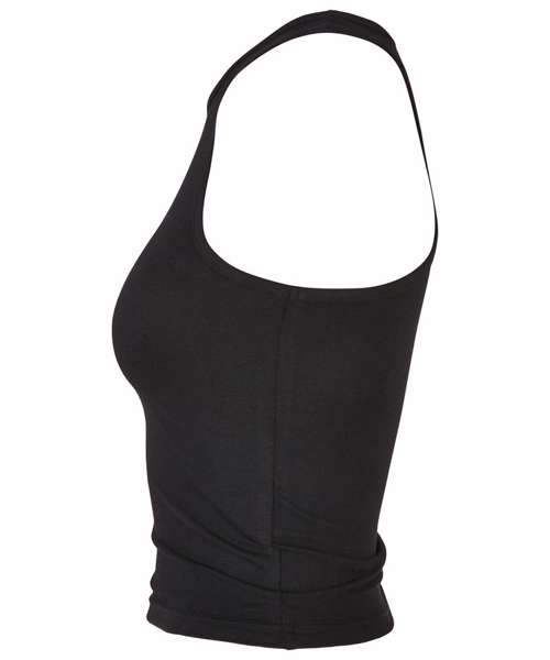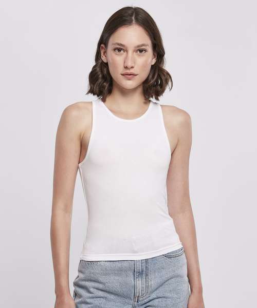 Equipped with a dynamic, sporty racerback cut, the otherwise plain, single-coloured women’s top sets a style statement. This women’s top offers a high crew neck on the front, while the cut is slim fit and the length is kept short. A pleasant wear is ensured by a material mix of cotton and elastane. The summery style can be individually refined further, either by flock or screen printing or with embroidery.