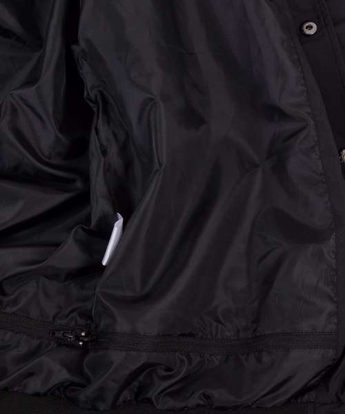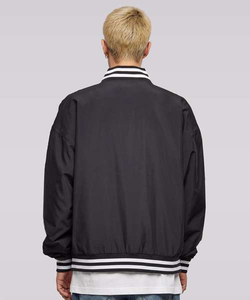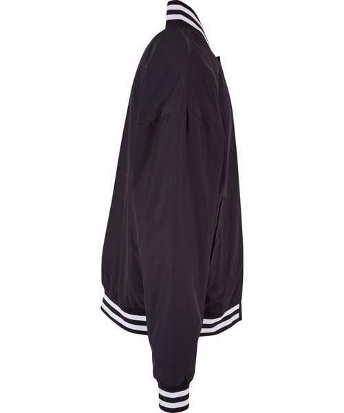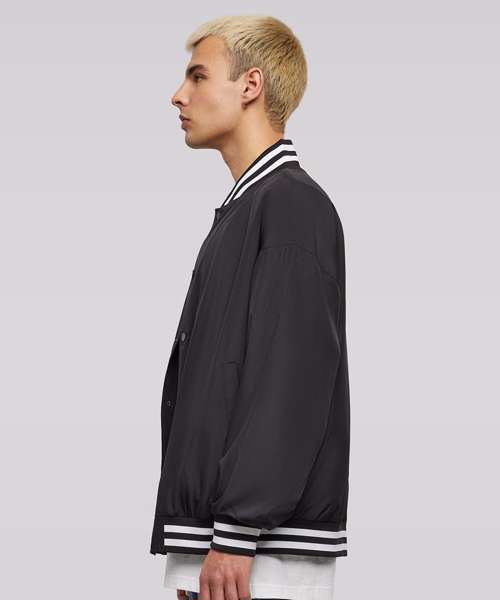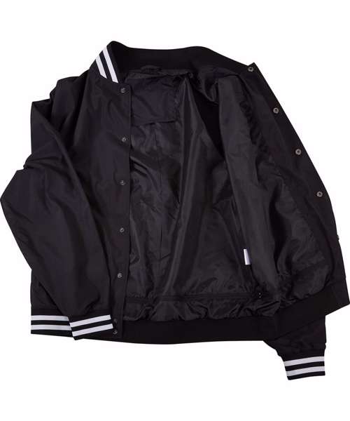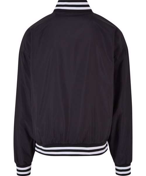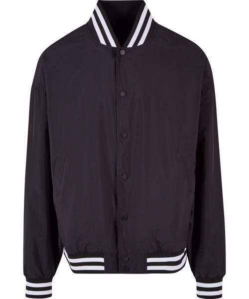 This traditionally styled men’s college jacket is a sporty classic with a striped stand-up collar and elastic cuffs on the sleeves and hem. It has a casual, loose fit with dropped shoulders, fastening via a snap button placket. The light college jacket is made from robust polyester fabric and can further be refined with screen or flex printing.