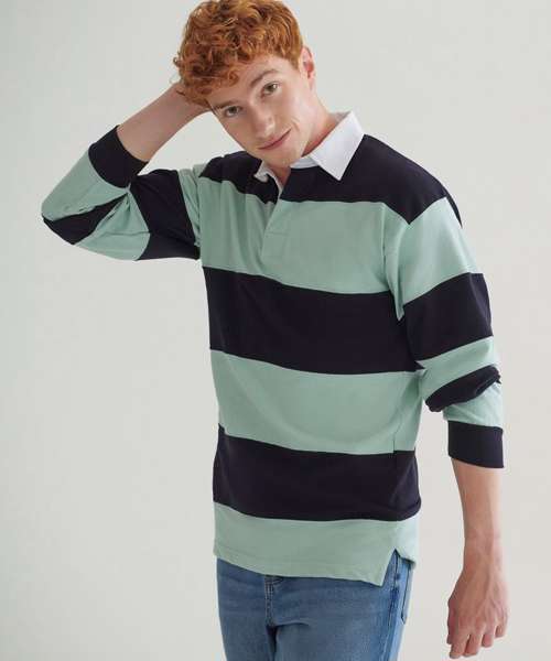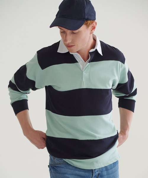 Sewn Stripe Rugby in heavy jersey. Traditional rugby collar with cotton webbing. Taped shoulders and side vents. Rubber buttons. Elastane re-inforced cuffs for shape retention. Twin-needle seams and hems. Rugby leisurewear garments are for leisure use only.