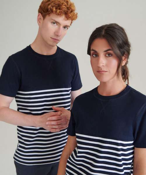 Tag free regular fit, heavyweight short sleeved t-shirt. Crew neck with stretch ribbed neckline. Twin-needle stitching at cuffs and hem. 'V' flatlock stitching detail at neck. Flatlock stitching at neck, shoulder seam and armholes. High chest seam. Striped lower body; contrast plain upper body and sleeves. Coordinates with FR134 long sleeved Breton T.