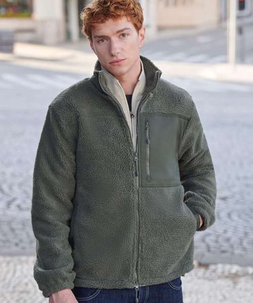 Zip-through fleece jacket, regular fit. Lined with embroidery access. Contrast funnel collar, fleece inner. Flatlock-stitched contrast panels – 100% cotton twill. Front chest pocket with zip. Welt side pockets with popper fastening. Elasticated cuffs. Curved hem with elasticated cord. Tag-free for easy rebranding.