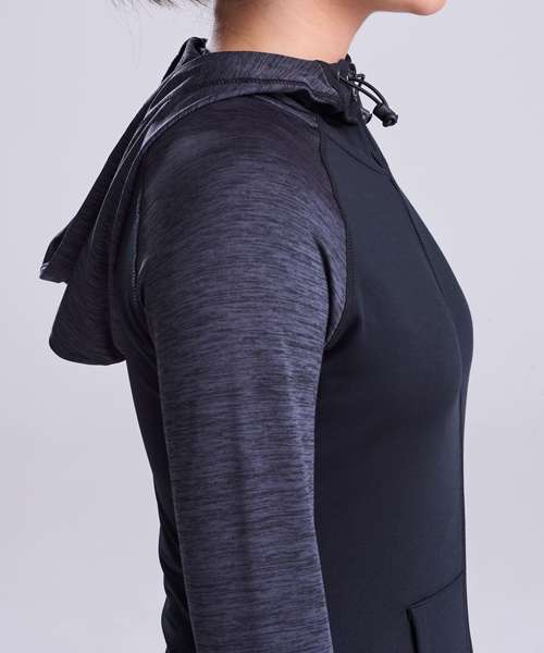 Feminine fit sports zoodie with adjustable drawcords hood, raglan sleeves with thumb holes and full-front zip. Contrast fabric on sleeves and body.