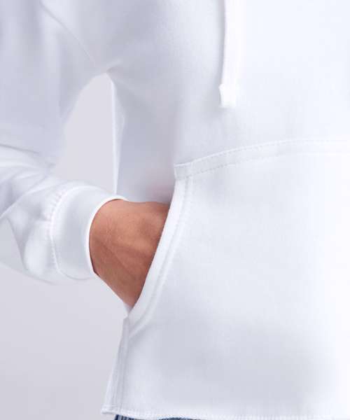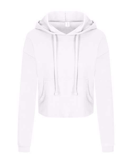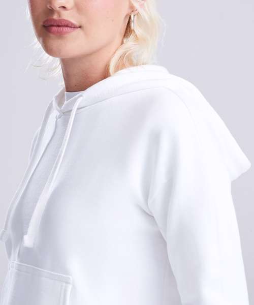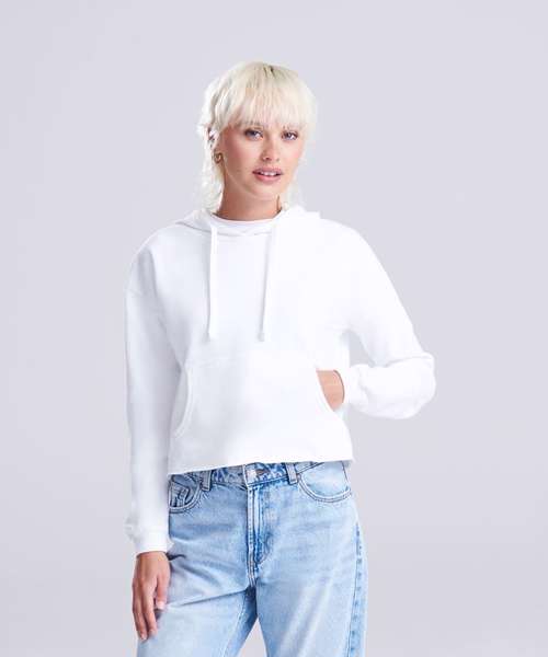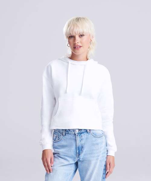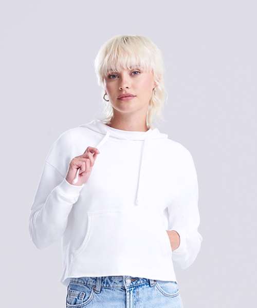 Girlie relaxed fit. Cropped cut with drop shoulder design. Kangaroo pouch pocket. Twin-needle stitching detail. Raw edge hem with cover stitching. Double fabric hood. Flat lace drawcords. Soft cotton faced fabric creates ideal printing surface. Simple tear-out label makes it perfect for rebranding. Brushed inner fleece. WRAP certified. SEDEX certified. Vegan certified.