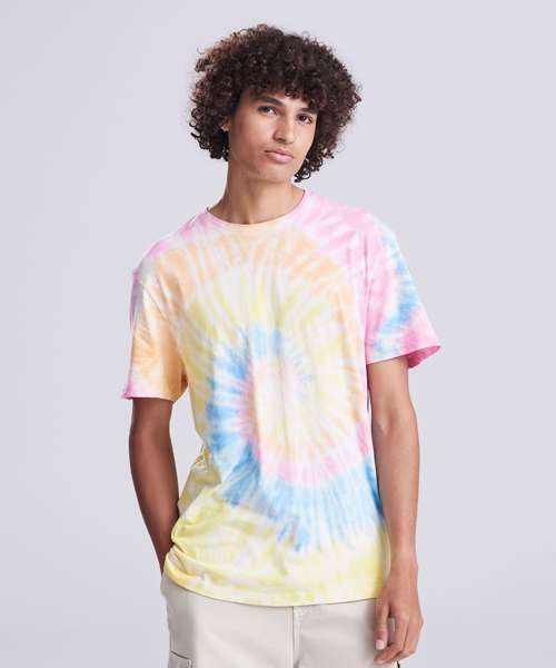 Modern fit with side seams. Short sleeves. Tie-dye design. Every piece is unique. Size label only, for easy rebranding – colour-coded black for unisex. Combed ringspun cotton for ultra comfort. Surface excellent for print or embroidery. Taped neck. Ribbed crew neck style. Twin-needle stitching detail on sleeve and bottom hem.