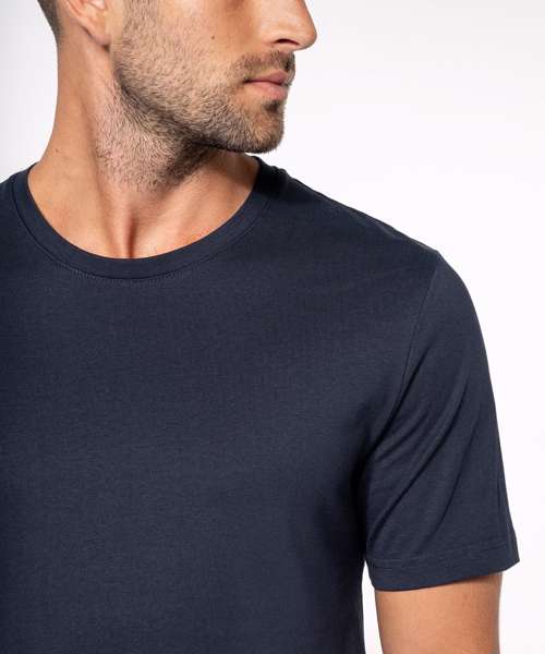 100% Cotton enzyme washed for extra soft hand feel (Oxford grey : 90% Cotton / 10% Viscose). Slim fit. Self fabric neckline. Heather Grey contrast taped neck for all colours, except for white body where tape neck is White and Oxford Grey body where tape neck is Dark Grey. Twin needle finishing. BSCI certified. Oeko-Tex certified.