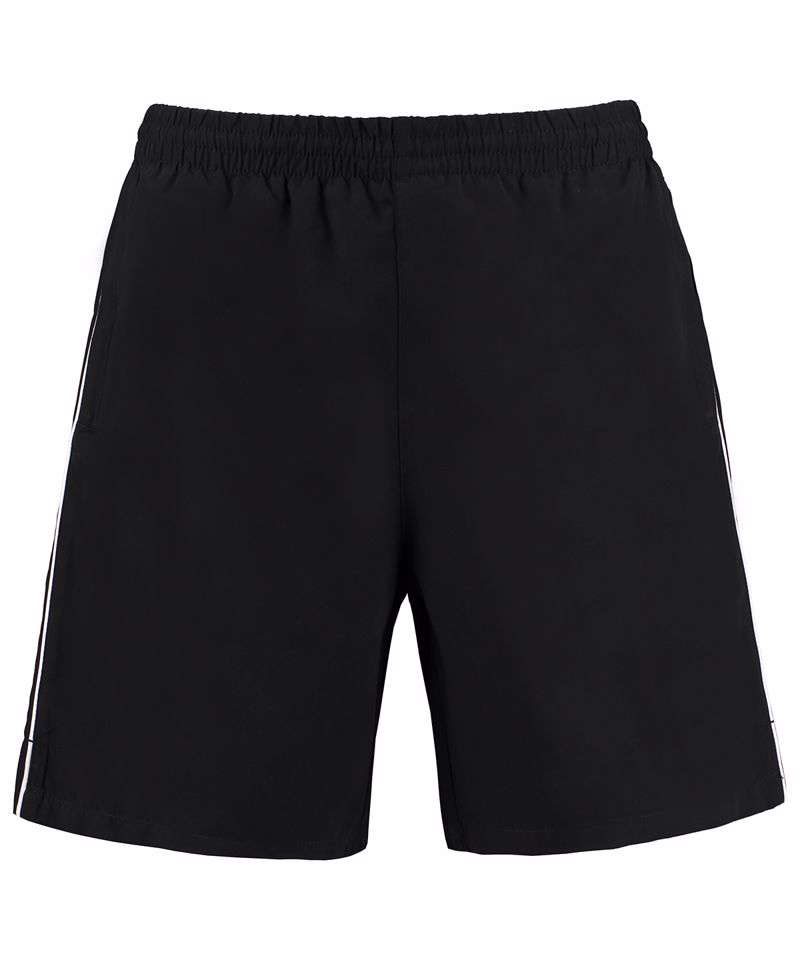 Elasticated drawcord waist. Two side zipped pockets. Straight hem. Contrast piping down outside leg. Side vents. Polyester mesh brief lining. Gamegear® woven label.