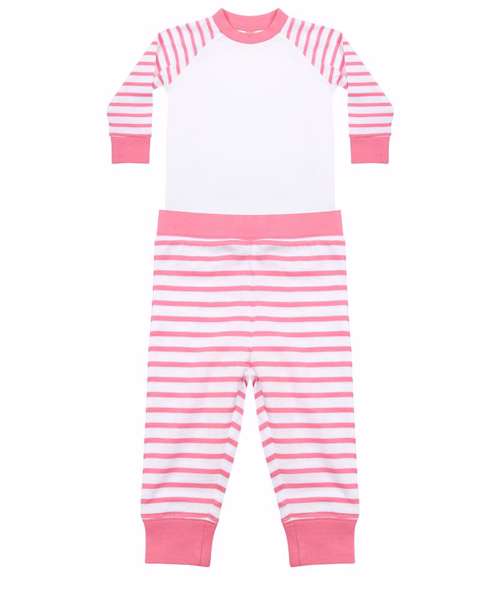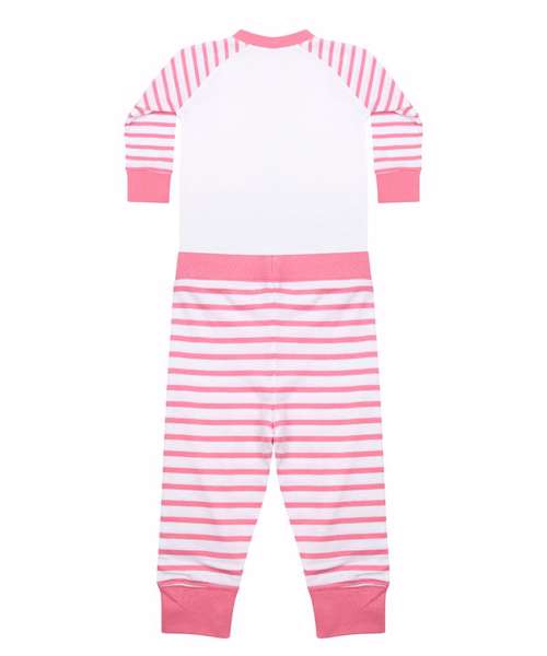 Striped pyjamas in 100% cotton single Jersey with plain 100% polyester front and back body panels suitable for sublimation printing. Contrast ribbed cuffs. Raglan styling. Bodysuit vest. YKK popper fastening. Bound neck and armholes. Made in soft cotton interlock. Size tab only.