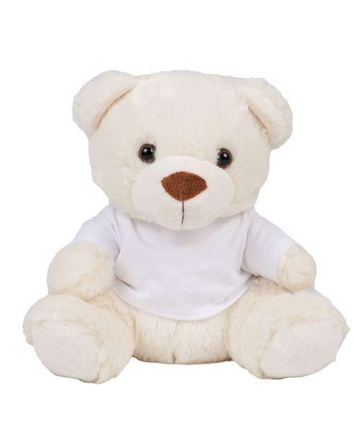 Bear in a t-shirt - plush cream and mid brown coloured bears dressed in a removable white cotton T-shirt. Ideal for decoration. Remove all hang tags and their fasteners before giving these items to a child. Suitable for all ages 0+. Complies with EN71 European Toy Safety Regulations.