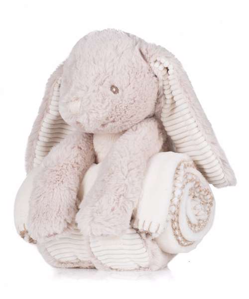 Light Brown soft plush rabbit. Contrast cream corduroy under ears and on paws. Hook and loop fastening on paws. Separate cream blanket in microfleece with contrast blanket stitching on edge. Delivered in a presentation bag with cream ribbon. Remove all hang tags and their fasteners before giving these items to a child. Suitable for children of all ages. Complies with EN71 European Toy Safety Regulations.