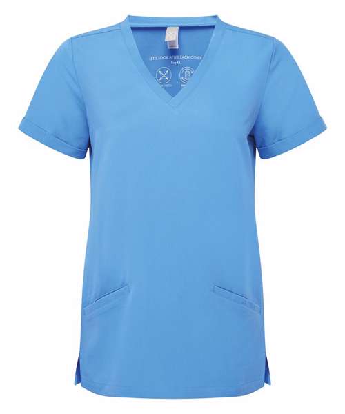 Women’s short sleeve scrub tunic. Comfortable four-way stretch. Breathable, easycare, crease-resistant fabric. V-neck, turn-up sleeves and two front pockets. Back darts, side vents and modern fit. Decorate with embroidery and/or print. Contains certified recycled polyester.