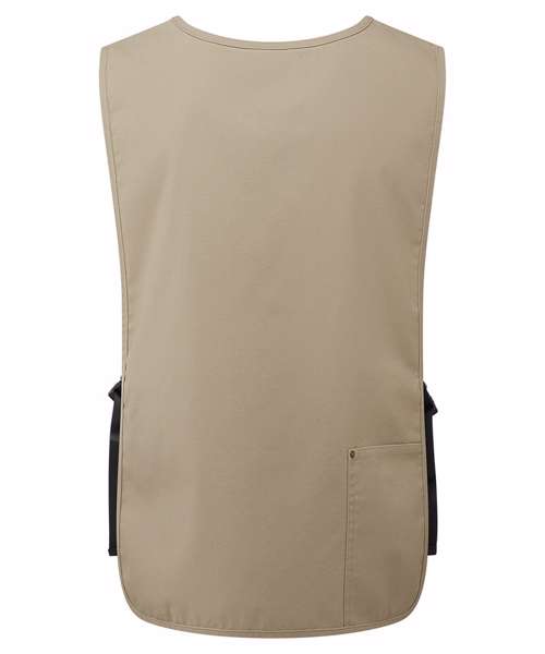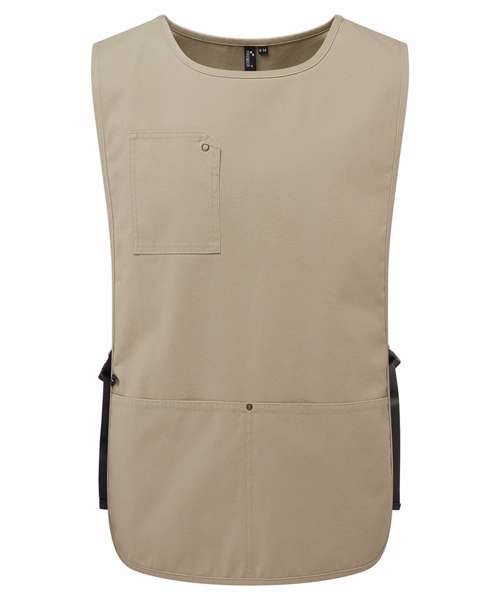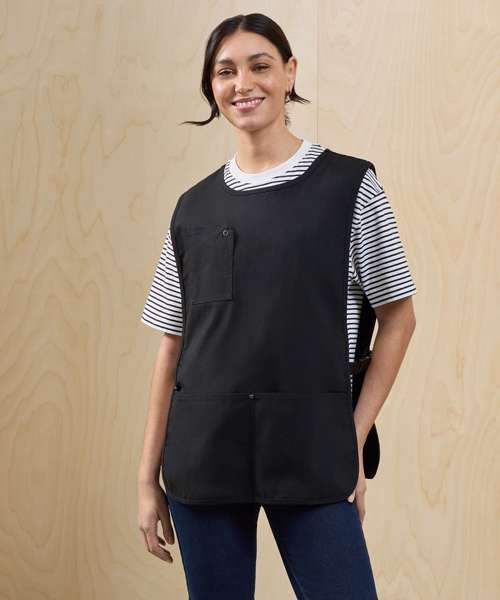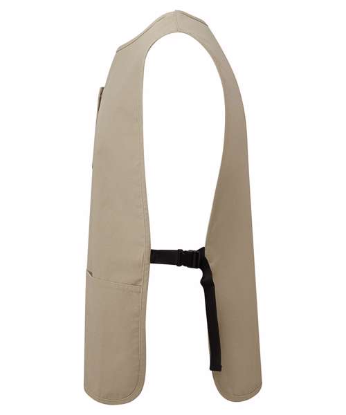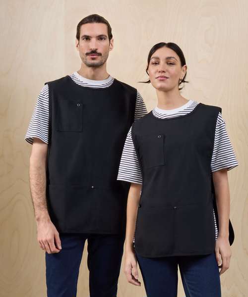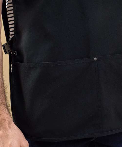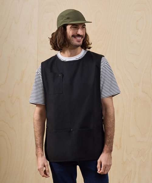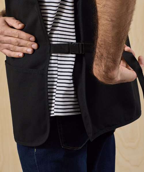 Over-the-head vest apron. Heavyweight, durable canvas fabric. Side fastening with seatbelt-style straps and clip fastening buckle. Left chest pocket with press stud fastening. Two, large tablet-friendly pockets. Finished with a trimmed edge. Two unisex sizes. Contains certified recycled polyester. Available in sizes S/M (70cm long x 36cm wide) and L/XL (78cm long x 38cm wide).