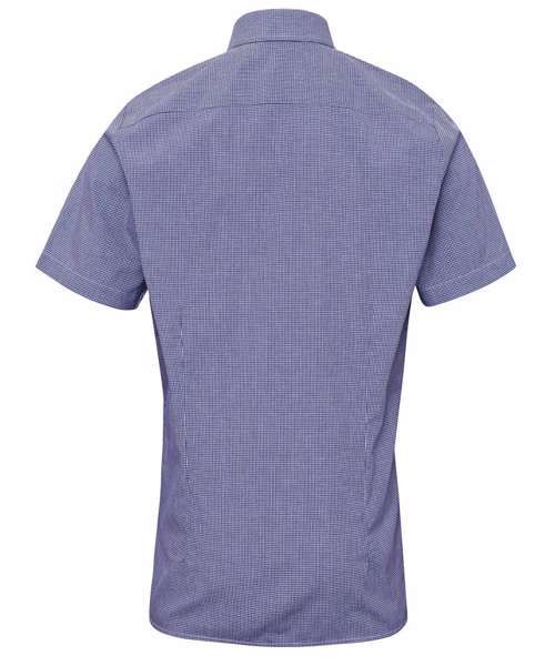 A short sleeve shirt with soft collar styling. Two colour Microcheck gingham style pattern. Semi-fitted styling.
