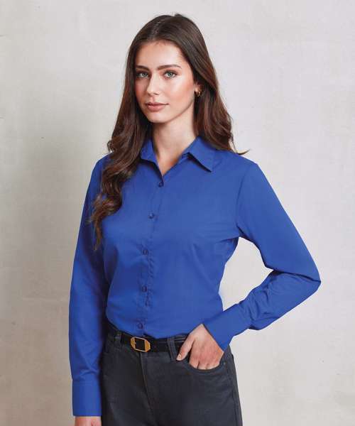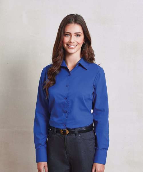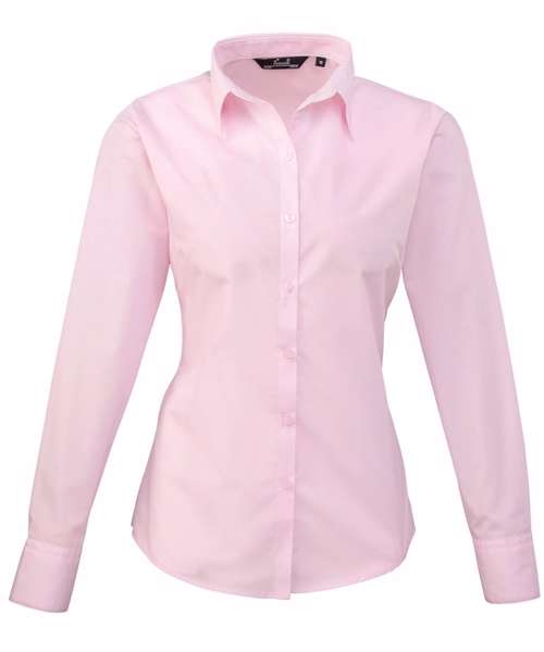 An stylish long sleeved ladies Poplin blouse that comes in 27 colours from Premier's 'Colours Collection.' This blouse offers the wearer a semi-fitted feminine styling with a soft collar, bust, back darts and a rounded bottom hem. A great all-round every day work blouse.