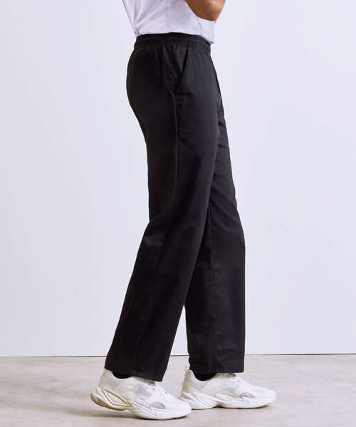 Unisex pull on chef’s trouser. Available in Black or White check or plain Black. Elasticated waist for easy pull on trouser. Unisex sizing. 30.5" inside leg. Side swing pockets. Drawcord.