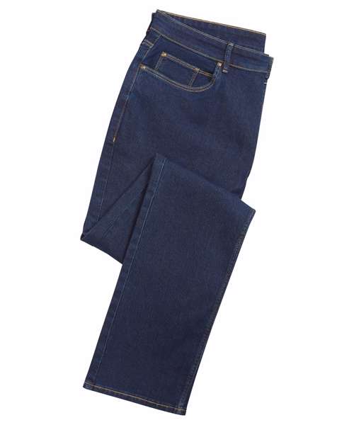 Men’s classic straight-leg jeans with a fade-resistant finish tested to 20 washes. Durable fabric fit for everyday comfort with elastane for stretch. Designed with belt loops, a metal button and a covered zip fly. Functional side-stitched pockets, rivets and stitched coin pocket with reinforced bar tacking. Stitched v-shape yoke and two patch pockets to the back. Classic jean styling with twin-needle stitching and metal hardware. Responsible fabric sourcing. Always Indigo contains certified recycled polyester. Available in regular leg (31"/79cm) and long leg (34"/86cm).