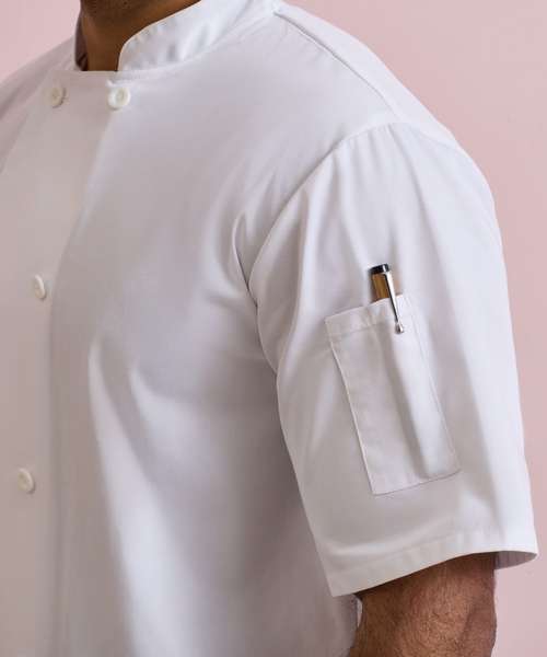 A very popular style seen in commercial kitchens, this short sleeve chef's jacket features a ten button wrap over fastening. To withstand the demands of repeated washing, the buttons are long life resin buttons. A very smart jacket for chef with a mandarin collar for a streamlined look. The left sleeve features a useful pen pocket.