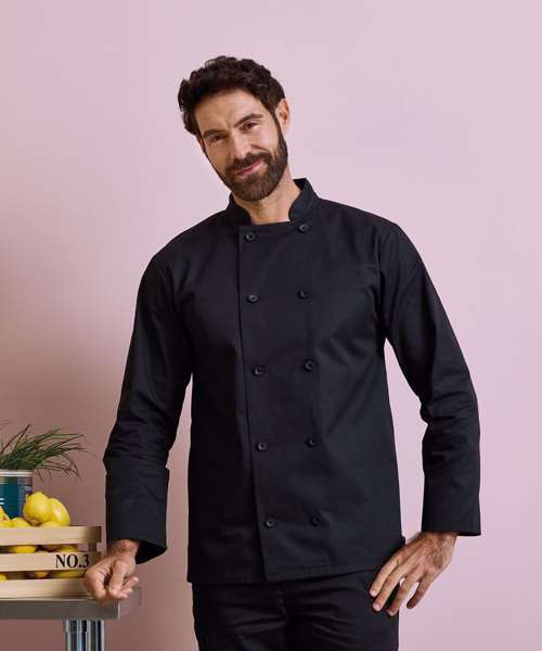 An easycare long sleeve chef's jacket with a ten-button wrap over style fastening. To withstand the demands of repeated washing, the buttons are long-life resin buttons. A smart jacket for chefs with a mandarin collar for a streamlined look. Available in black, white and steel across a wide range of sizes.