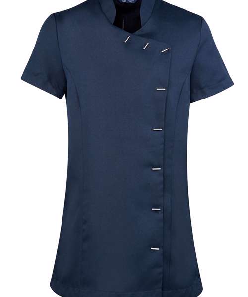 This popular 'Orchid' tunic is available in a wide range of colours and features an asymmetric design with eight 'bar' buttons down the front. The side vents and princess seams create a flattering fit whilst the short sleeves and back pleat allow complete ease of movement. A great uniform solution for salon staff who need to look co-ordinated.