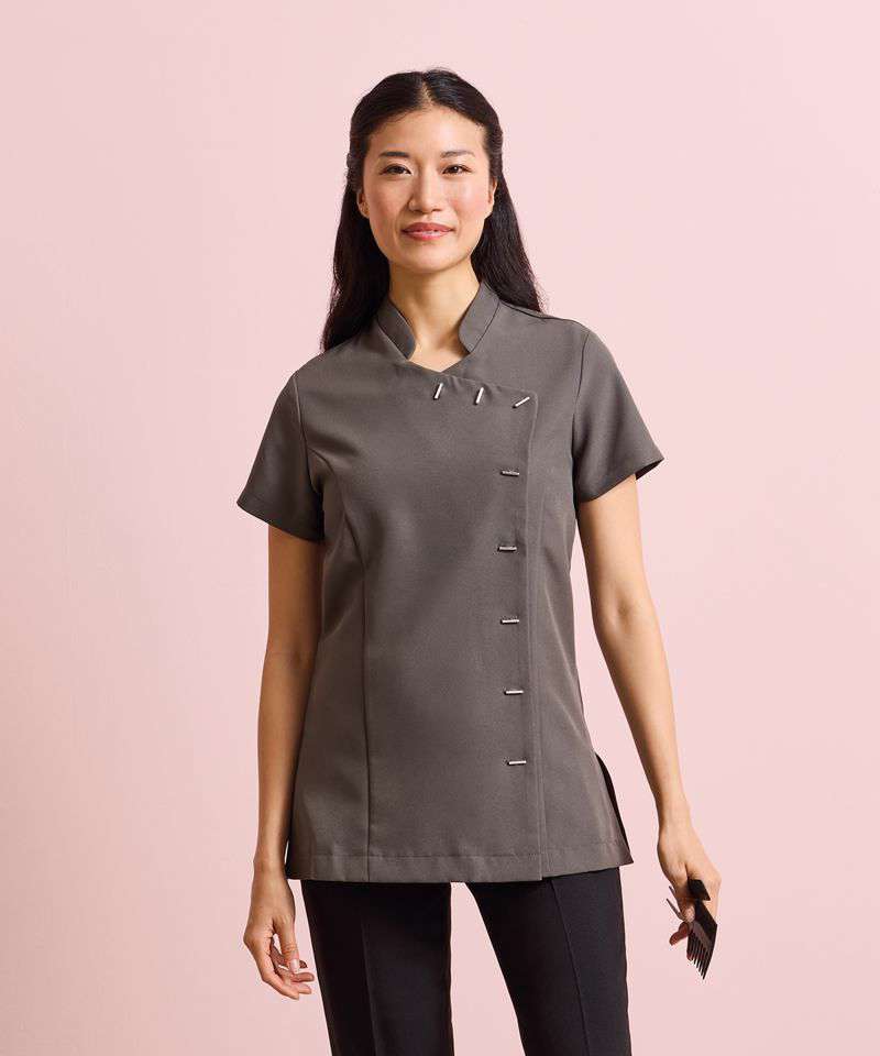 Beauty and spa tunic with mandarin collar. Asymmetric button fastening to the front with eight bar shaped buttons. Short sleeve. Side vents. Back pleat for ease of movement. Princess seams. Easycare.