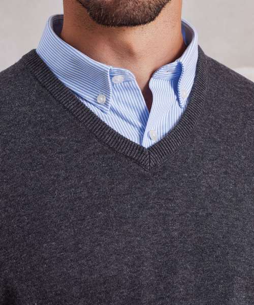 A V-neck long sleeve men's sweater made with a fine gauge knitted cotton rich yarn for a soft and comfortable feel. The set in sleeves and hem give a contemporary feel to the jumper making this a great piece to layer up over a shirt.