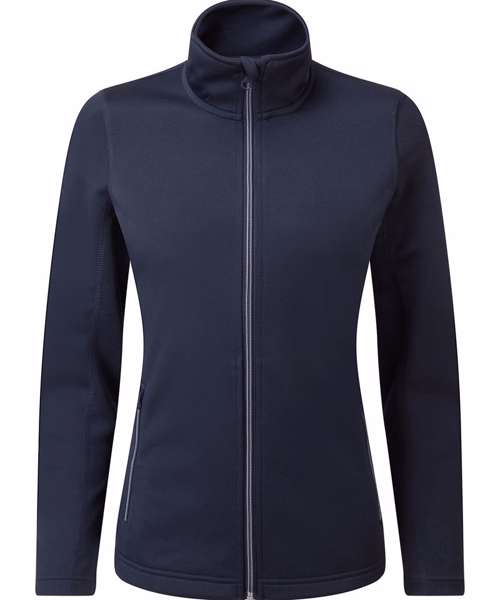Women's zip-through sweat made with spun dyed certified recycled polyester yarns, a fabric with less impact for a corporate-casual solution. Styled with a fashionable cadet collar and a contrast coloured zip with zip pull. Two external side pockets bear the same zip styling, for a uniform look. Finished with top stitching for a pleasing design feature.