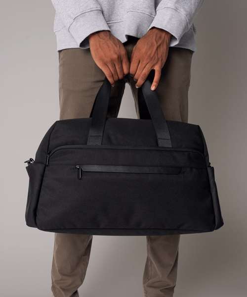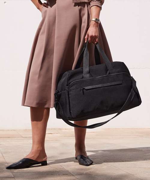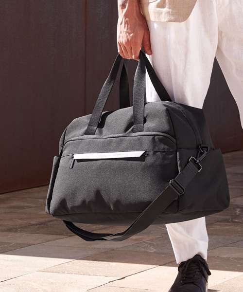 Minimalist styling. Zipped main compartment. Premium-finish internal lining. Three slip pockets inside main compartment. Two large end slip pockets. Rear zipped pocket doubles as a sleeve to slide over a suitcase handle. Outer zipped front pocket with rain flap and internal slip pockets. Detachable adjustable shoulder strap. Premium webbing carry handles. TearAway label for ease of rebranding. Overhead cabin luggage size – suitable for most airlines. 100% certified recycled polyester fabric.