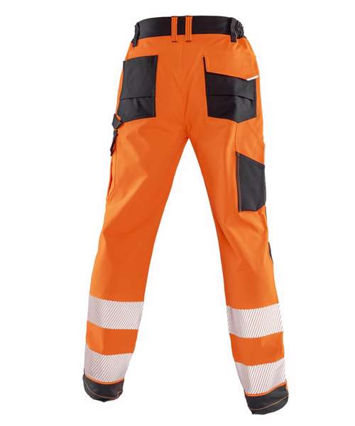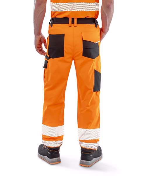 Soft-feel, wrinkle-free stretch fabric, springs back to shape. Elastomultiester fibres' unique structure provides a more sustainable recycled choice to traditional elastane: moisture-wicking properties and increased resistance to damage lead to longer-lasting garments and help reduce textile waste. 9 pockets including reinforced ruler pocket, multicompartment thigh pockets, and expandable back pockets. Trebel stitched critical seams. Side elasticated waistband with high back. Ankle scuff panel masks grime. Articulated knee zone. Printed safety bands. Zip fly with rivet. Hammer loop. Belt loops. Slim fit. Elastane-free. TPU-free. UKCA, EN ISO 20471:2013+A1:2016 CLASS 2. ORANGE: RIS-3279-TOM ISSUE 2:2019 CLASS 2.