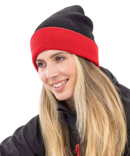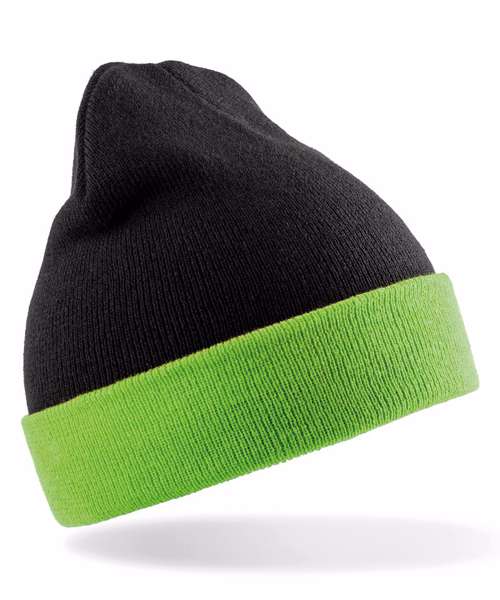 Beanie made from 50% recycled materials. Contrast colour deep cuff. Double thickness. Full size style. Soft-feel knit.