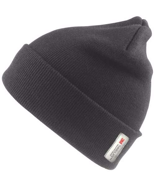 Beanie made from 50% recycled materials with Thinsulate. 3M label sewn outside. Double thickness. Full size style. Deep Cuff. Soft-feel knit.