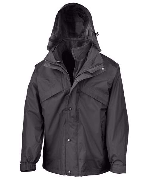 Double stitched taped seams. Concealed fully featured hood in collar with chin guard and shockcord adjuster. Full front heavy duty 2-way zip fastening. Zip and clip system for attached to inner jacket. 2 spacious side pockets and 2 spacious chest pockets. Elasticated cuffs with tear release adjusters. Adjustable shockcord hem and stud closing double storm flap. Underarm ventilation eyelets. Wrinkle/crease resistant fabric. High zip through collar with shockcord adjusters. Stud closing double storm flap. Inner jacket. 2 spacious side pockets. Full front zip fastening. Elasticated cuffs. Contains recycled material.Decoration Guidelines:Decorating methods: Outer: Embroidery, Transfer print & Screen print transfer. Inner: Embroidery & Transfer print. Decorators access point: Concealed Inner back & left chest zips.