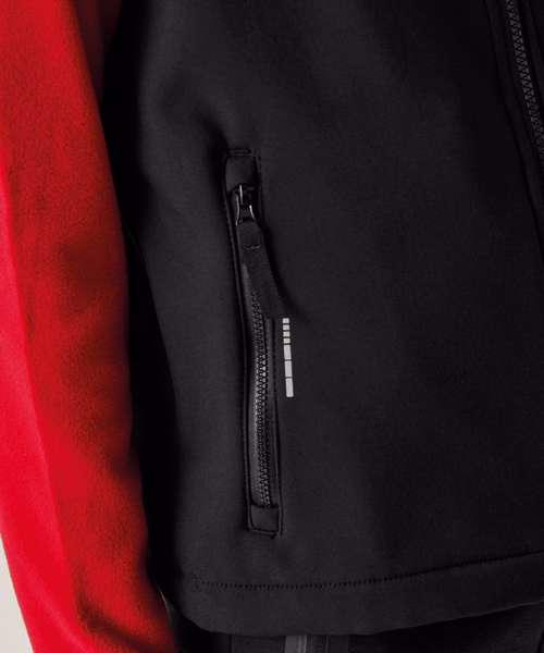 Warm-backed, woven, stretch softshell fabric. Ideal for screen, transfer and vinyl printing. Inner zip guard. Two zipped pockets. Reflective print detail. Made using recycled materials.