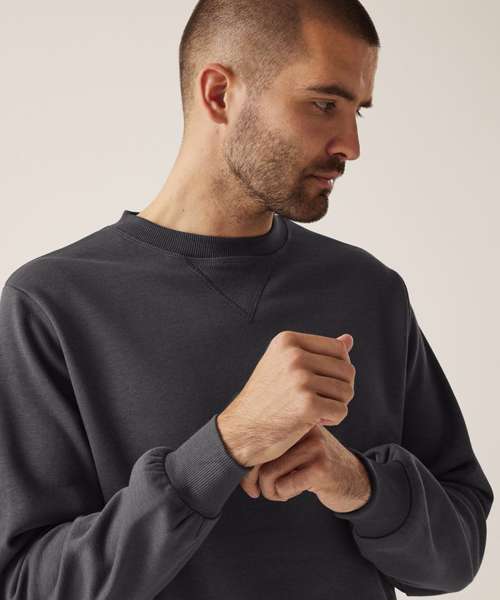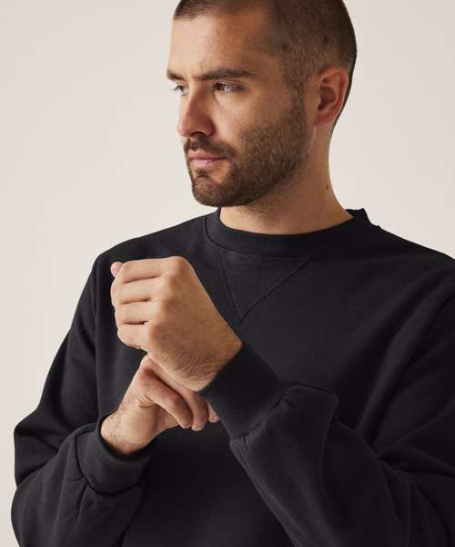 35% sustainable cotton and 65% polyester brushed back fabric. Ribbed cuffs and hem. Crew neck.