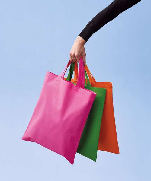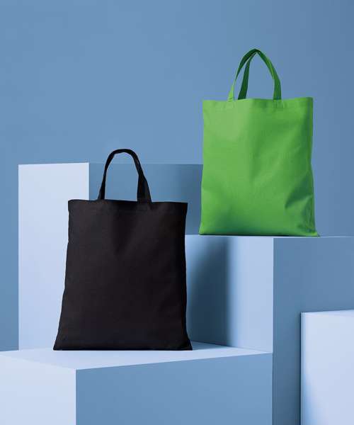 Classic cotton shopper. Short handles, 35 x 2.5cm. Inside hemmed sewing. Cross-stitches at handle. Perfect print surface.