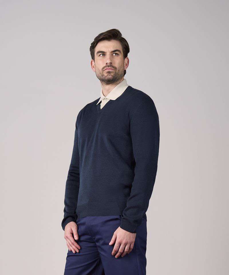 Fashioned v-neck. Set-in sleeve. Knitted saddle shoulder. Knitted rib neck, cuff and welt. Modern unisex fit.