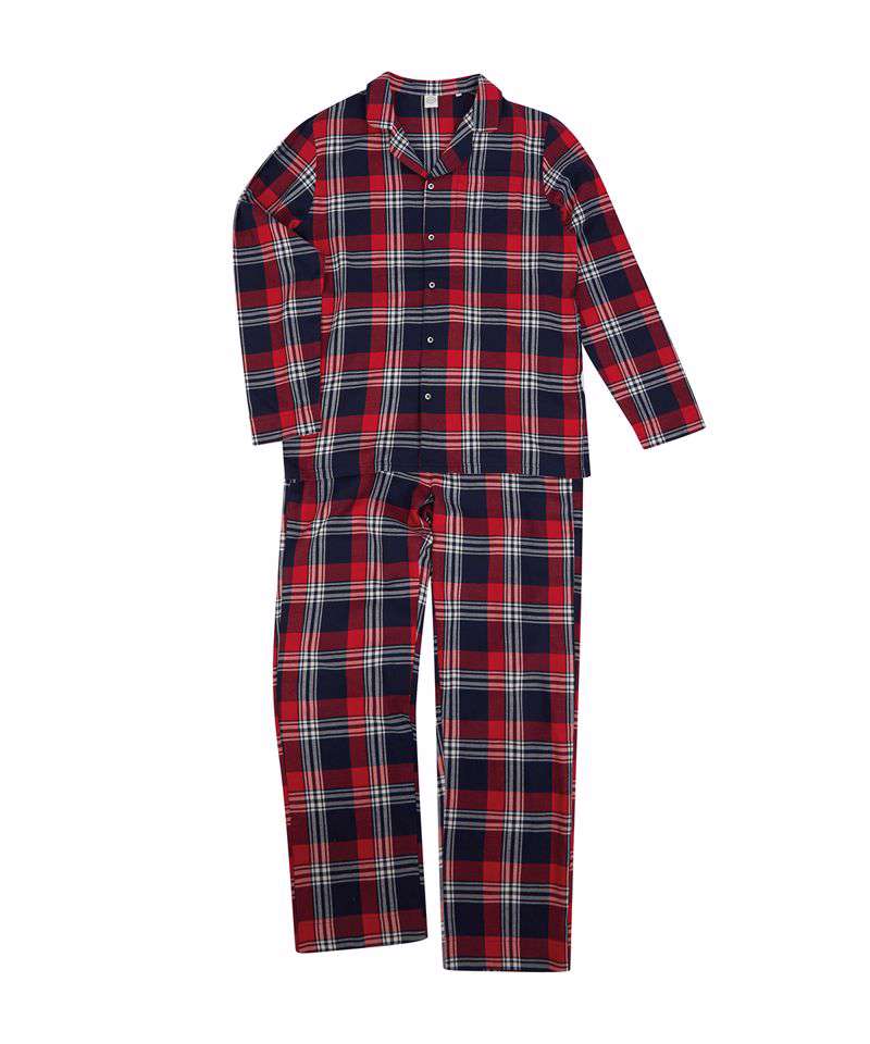 Woven tartan lounge set with plain hem. Shirt with a pyjama collar and pearlised button front, and bottoms with a full elasticated waist. Tear-out label.