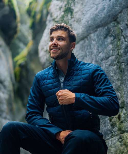 Stormtech Thermolex™ high-loft synthetic down. Durable water-repellent finish. High-performance windproof outer shell. Bonded stretch softshell panels and sleeves. Adjustable hem with drawcord. Zipped handwarmer pockets. Internal full-length storm flap with brushed tricot. Articulated elbows. Decoration access. Contains recycled polyester.