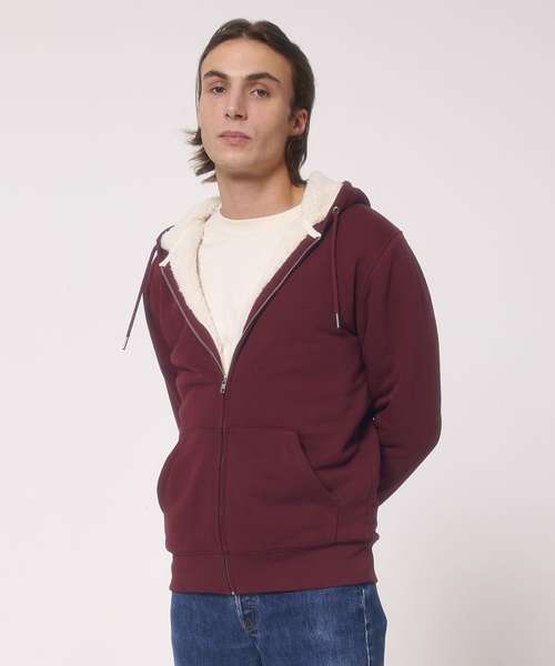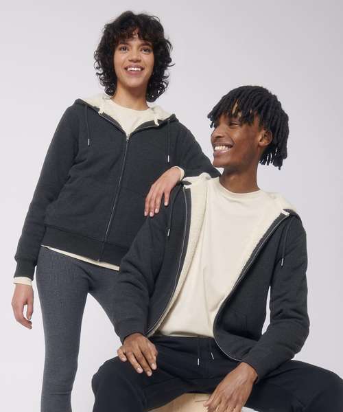 Unisex sherpa lined zip-through hoodie sweatshirt. Set-in sleeve. Lined hood in recycled sherpa. Round drawcords in matching body colour with metal tipping. Metal eyelets. Inside herringbone back neck tape in greige colour. Self-fabric half-moon at back neck. Covered metal zip at centre front. 1x1 rib at sleeve hem and bottom hem. Armhole, sleeve hem and bottom hem with twin-needle topstitch. Kangaroo pocket at front. Fully lined with recycled sherpa inside chest pocket. Inside invisible zip at bottom hem for easy decoration.