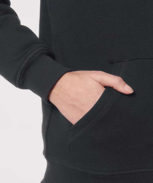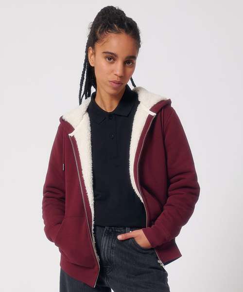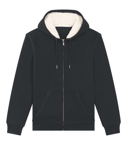 The medium fit unisex sherpa lined zip-through hoodie sweatshirt features a lined hood in recycled sherpa, and has round drawcords in matching body colour with metal tipping. Inside invisible zip at bottom hem for easy decoration.