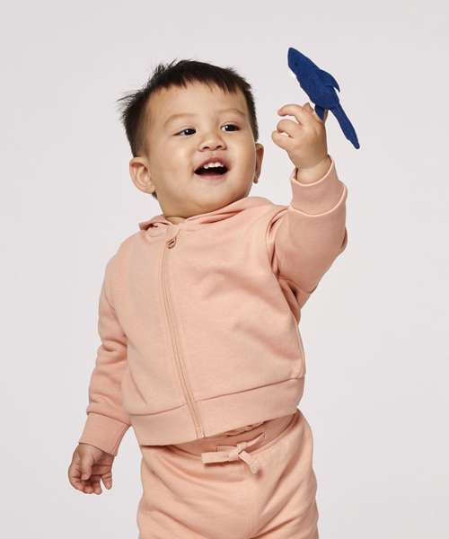 Baby zip-through sweatshirt. Set-in sleeve. Lined hood in single Jersey. Single Jersey tape at inside back neck and at inside of zip. Nylon coil-reversed zip at centre front. Two-sided zip guard at top of zip. Self-fabric half-moon at back neck. 1x1 rib at sleeve hem and bottom hem.