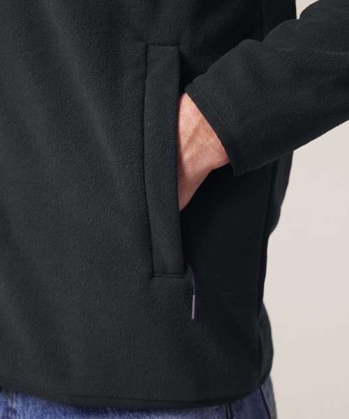 Set-in sleeves. Elastic binding at neck edge, cuffs and hem. Inside back neck grosgrain loop. Nylon coil zip with metal zip pull and cord ending. Brushed fabric with anti-pilling finish on the inside and outside. Front side welt pockets with zip opening. Inside back neck tape in recycled polyester.