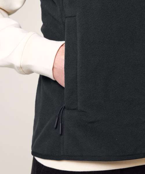 Sleeveless. Elastic binding at neck edge, armhole and hem. Inside back neck grosgrain loop. Nylon coil zip with metal zip pull and cord ending. Brushed fabric with anti-pilling finish on the inside and outside. Front side welt pockets with zip opening. Inside back neck tape in recycled polyester.